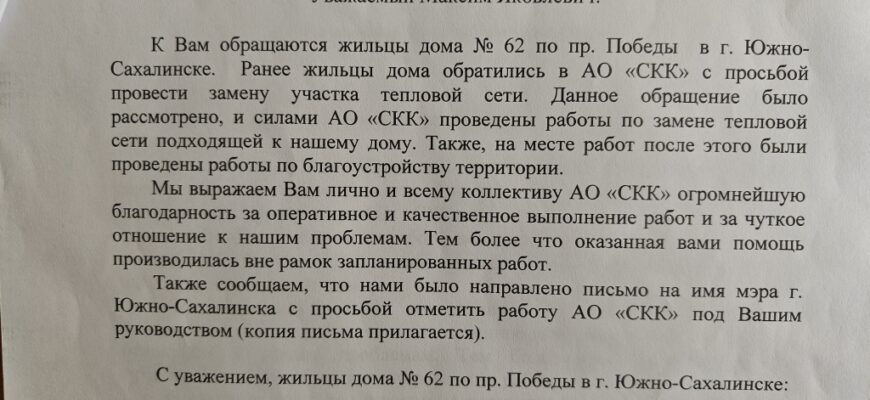 Такие письма в «Сахалинской Коммунальной Компании» получают не так часто, как хотелось бы — несмотря на тяжёлый, самоотверженный труд сотрудников
