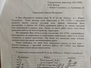 Слова благодарности за труд и внимание от жителей одного из домов в Южно-Сахалинске не на шутку расстрогали коллектив АО «СКК».